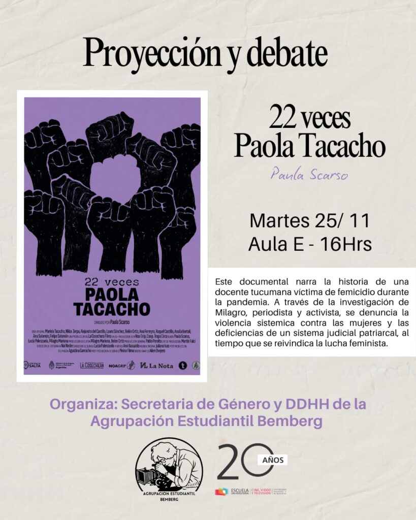 Invitamos a la comunidad a la proyección y debate de la película “22 veces Paola Tacacho”, dirigida por Paula Scarso, el 25 de noviembre: Día Internacional de la Eliminación de la Violencia contra la Mujer, a las 16 h en el Aula E de nuestra Escuela.